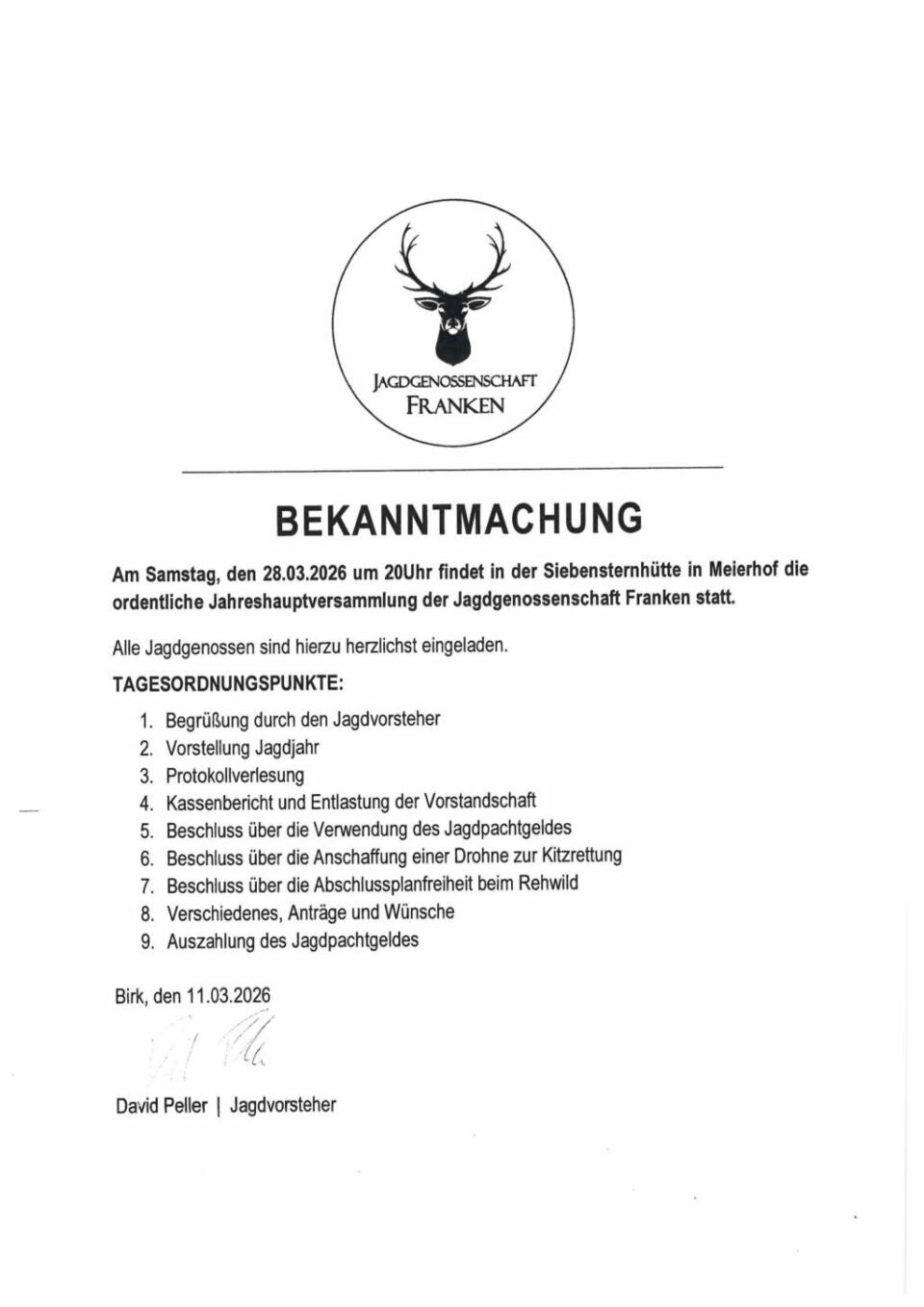 JHV Jagdgenossenschaft Franken 28.03.2026 • 20:00 Uhr Siebensternhütte OT Meierhof Weißenstadt - 95163 Bad Weißenstadt